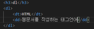 dl은 용어와 설명을 하나의 아이템으로 나열하는 리스트이다. 정의 리스트 전체는 dl을 사용하며, 각 아이템에서 용어는 dt, 설명은 dd로 표현한다.