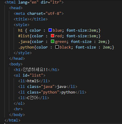 style 안에 있는 h1, #list, .java, .python이 셀렉터이다!
